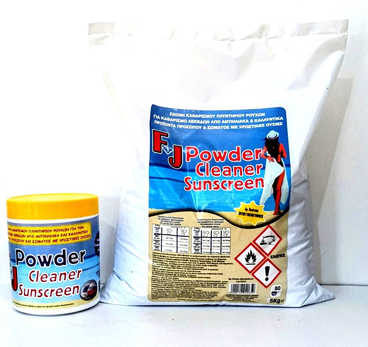 Το FJ Powder Cleaner Sunscreen είναι η μοναδική σκόνη που καθαρίζει λεκέδες από αντιηλιακά, make up, λάδια, μάσκαρα, καλλυντικά προσώπου και σώματος, σκουριές και κιτρινίλες και πολλούς άλλους λεκέδες. Μια μοναδική, ισχυρή πατέντα από τον εφευρέτη της κ. Ιωάννη Φωτακόπουλο. Αυτό το προϊόν καθαρίζει σε βάθος όλους τους λεκέδες ακόμη και τους πιο δύσκολους. Κάνει τα ρούχα αστραφτερά και ζωηρεύει τα χρώματα, μαλακώνει τα ρούχα χωρίς προσθήκη μαλακτικού, κάνει αστραφτερές τις συσκευές και δεν αφήνει τα άλατα να επικάθονται σ αυτες. Έχει πλούσιο άρωμα φρεσκάδας. Το καλύτερο προϊόν της αγοράς με διαφορά, ελληνικής εφεύρεσης. Ένα μοναδικό προϊόν για επαγγελματική και οικιακή χρήση! Δεν χρειάζεται προσθήκη λευκαντικού ή οποιοδήποτε άλλο ενισχυτικό. Προσοχή να μην αναμειγνύετε το προϊόν με άλλα απορρυπαντικά, μπορεί να αλλοιωθεί η χρήση του. Απολαύστε τα τέλεια αποτελέσματα του προϊόντος.Το προιον αυτο παραγεται σε τρεις συσκευασιες του ενος κιλου,σε 5 κιλα και σε 15.